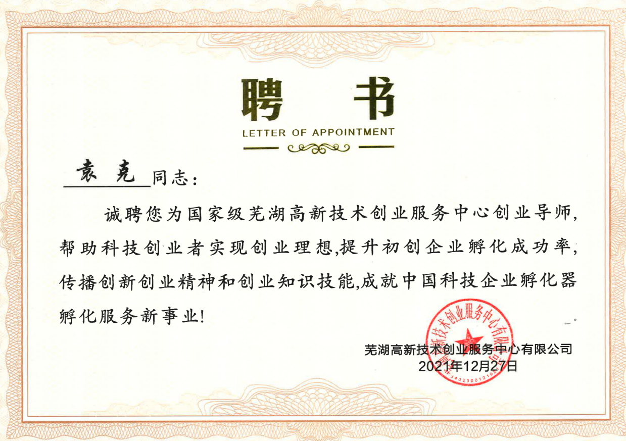 近日,我公司總經(jīng)理袁克同志被聘為國(guó)家級(jí)蕪湖高新技術(shù)創(chuàng)業(yè)服務(wù)中心有限公司“創(chuàng)業(yè)導(dǎo)師”。